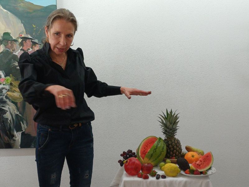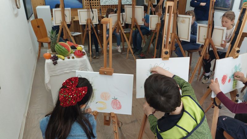 Sie hatte ein Stillleben aus Obst vorbereitet und erklärte: „Ihr müsst immer die ganze Leinwand im Blick haben und schauen, dass alles ausgefüllt ist.“ Sie wies auf den Granatapfel hin und sagte: „Seht ihr den Schatten auf dem weißen Tuch?“ Ob man alle Früchte malen müsse, fragte ein Mädchen. „Nein, nur, das, was du schön findest.“