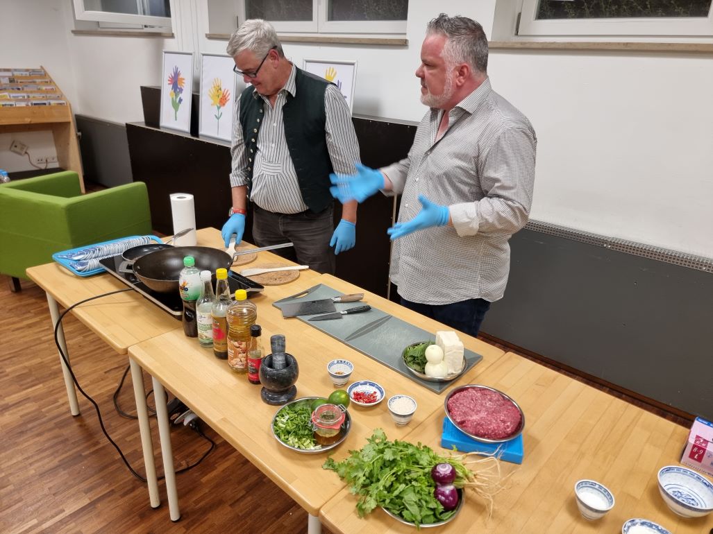 Zwei davon kochte Peter Denlo dann auch live im Keller der Miesbacher Stadtbücherei und bekam dabei Hilfe von Sigi Faltlhauser, der sich gleich beim ersten Gericht als „Tofujungfrau“ outen musste.