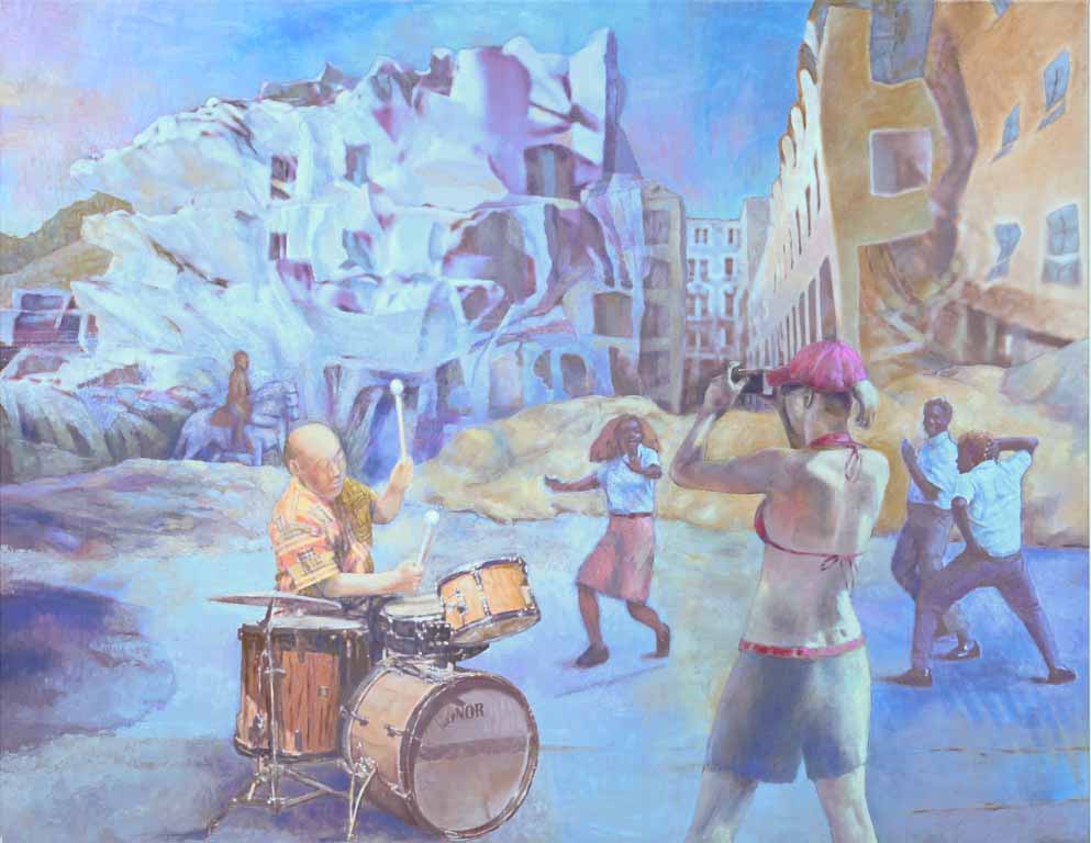 Dahinter ist ein großformatiges Bild von Horst Hermenau zu sehen. „Die ganze Welt“ zeigt den chinesischen Trommler, nach dessen Rhythmus afrikanische Mädchen vor Trümmern einer Stadt tanzen, während eine offensichtlich westliche Touristin die Szenerie fotografiert. Im Hintergrund erkennt man je nach Sichtweise entweder den Messias oder einen apokalyptischen Reiter.