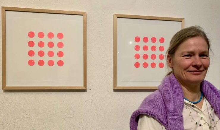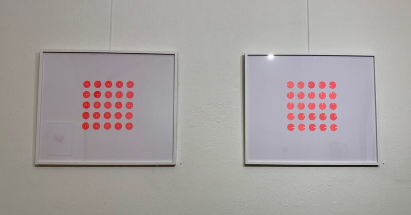 In der Ausstellung sind mehrere Arbeiten mit Punkten zu entdecken. Meist in Pink, mal mehr, mal weniger groß, fast immer ordentlich angeordnet, hin und wieder aus der Reihe tanzend. Setzt man sich etwas länger mit ihnen auseinander, kommen immer mehr Interpretationsmöglichkeiten zum Vorschein – frei nach Francis Picabia: „Unser Kopf ist rund, damit das Denken die Richtung ändern kann.“