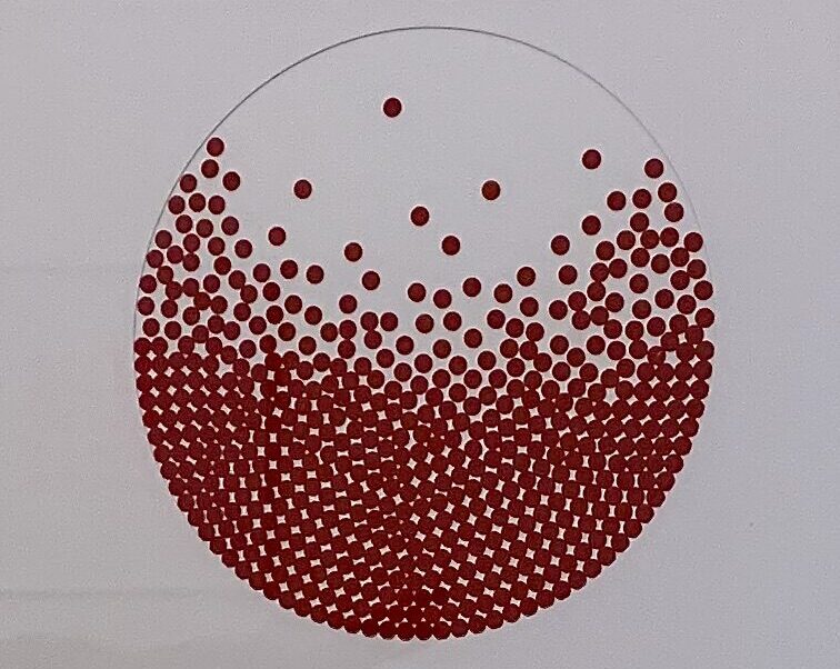Bei der ersten Arbeit der Ausstellung kommen bereits Unregelmäßigkeiten ins Bild. Zunächst werden streng geometrische Formen, die fast schon eine Art Markenzeichen von Katrin Hering sind, wahrgenommen: kleine weinrote Punkte. Sie scheinen sich in einem Kreis in Reih und Glied anzuordnen, wie auf den Boden einer Kugel hinabgefallen, um sie zu füllen. Einen Augenblick später schleicht sich jedoch der Gedanke ein: Was, wenn sich die Punkte gar nicht in der Fläche sammeln, nach unten schweben, um einen Verbund zu bilden, sondern aus der Kugel aufsteigen, sich verflüchtigen?
