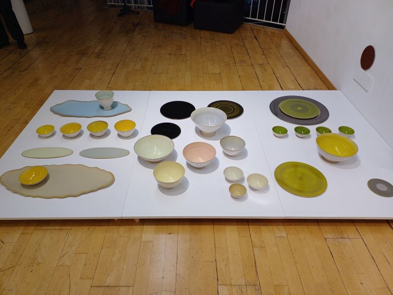 Dazu kommt ein drittes Element. Barbara Butz erklärt es an einem Teller auf dem rechteckigen Tisch, auf dem sie eine andere Farbwelt sichtbar macht. Im Gegensatz zu den rötlichen Erdtönen auf dem runden Tisch dominieren hier gelb-grüne Töne. Sie macht auf den Rand der Gegenstände aufmerksam. Dieser Rand hat eine andere Farbnuance als der Korpus. Damit erzeugt die Künstlerin einen internen Farbklang ihres jeweiligen Objektes.