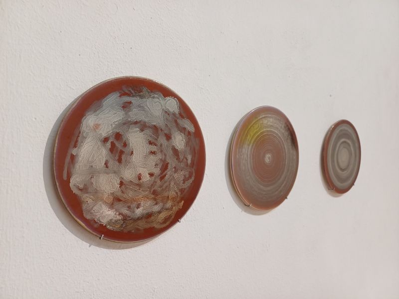 Neben den rein geometrischen Formen sei bei ihrem Fertigungsprozess die gewellte Form entstanden, verrät die Künstlerin, die sie Pfütze nennt. Bei ihrem Tun mit dem Ton an der Scheibe habe sich die Klecksform herausgebildet. Solche Formen finde man in der Natur und sie habe die Gegenstände installationsartig so angeordnet, dass eine bildnerische Komposition entsteht. Wie ein Schwarm mutet diese an der Wand an.
