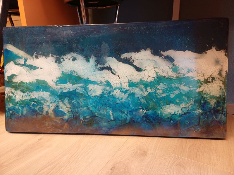 Manche Werke lässt sie nach ihr Schichtmalerei unbehandelt, manche versieht sie mit einem glänzenden Überzug. Sie experimentiere viel, sagt die Künstlerin, und wenn ihr ein Bild zu langweilig erscheine, dann füge sie beispielsweise Enkaustikwachs hinzu.
