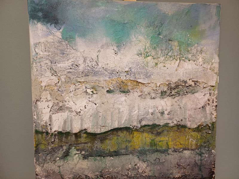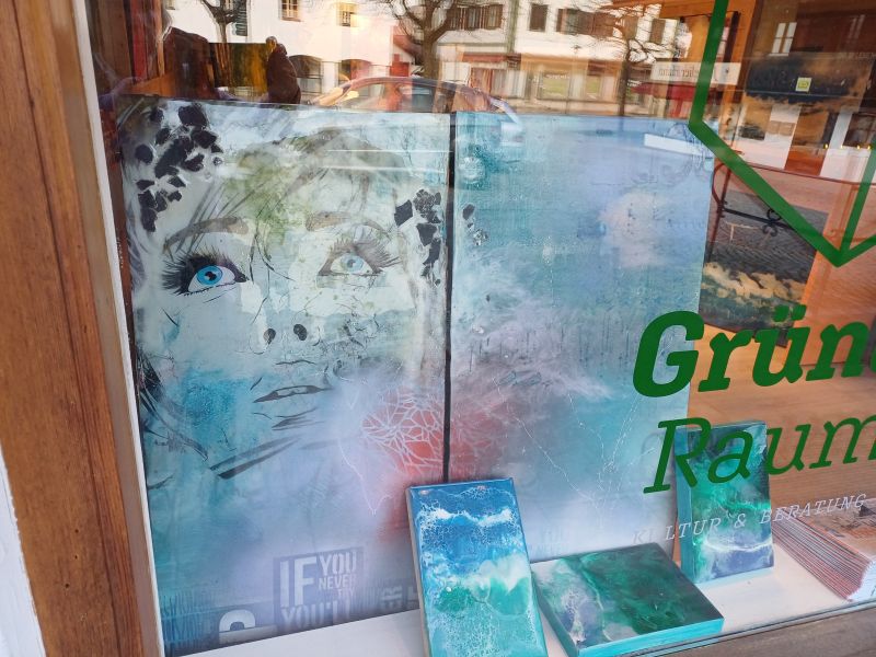 Ganz anders das Bild „Gegen den Wind“. Dies sei ihr in einem Kurs passiert, erzählt die Künstlerin, plötzlich habe sie in ihrer Malerei ein Boot am Chiemsee gesehen und habe das dann komplettiert. „Manchmal fühle ich mich verpflichtet, auch einmal etwas Gegenständliches zu machen“, erklärt sie und verweist auch auf die Bilder im Schaufenster, die sie mit Schablonen- und Enkaustiktechnik fertigte und mit Text ergänzte.