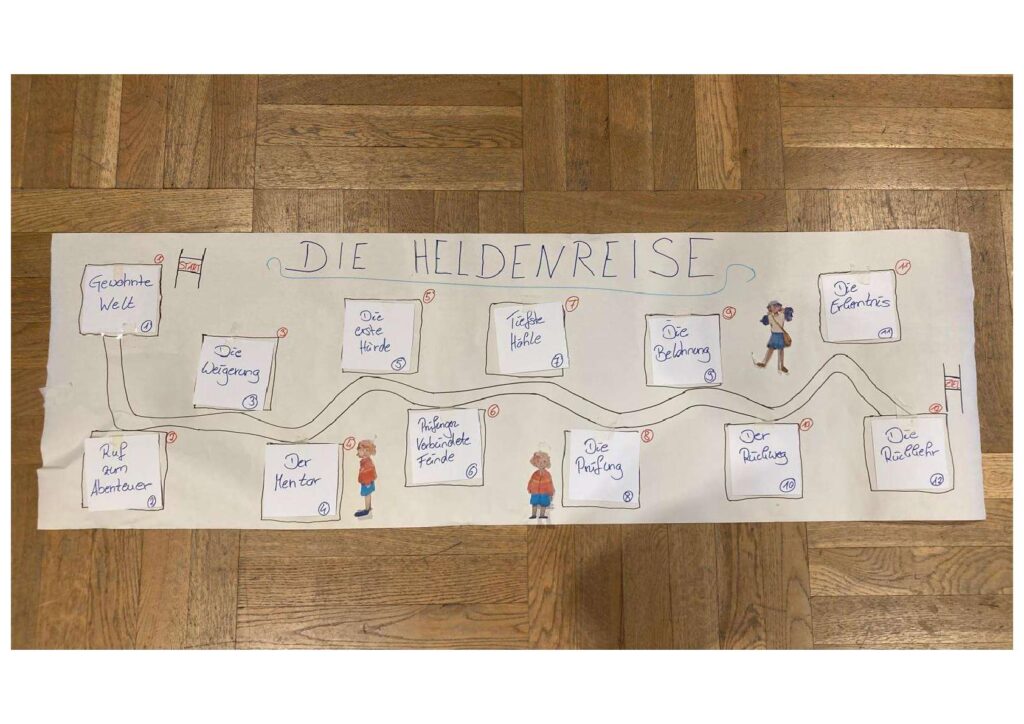 Emma, Käthe, Maxi, Johannes, Luisa und Mara ließen sich in fünf Workshops von dem Prinzip der Heldenreise inspirieren und erschufen die Heldin Sadara, ihren besten Freund Tim, sowie den Frosch Pfeili, den Kater Morle, die sie auf die abenteuerliche Reise schickten.
