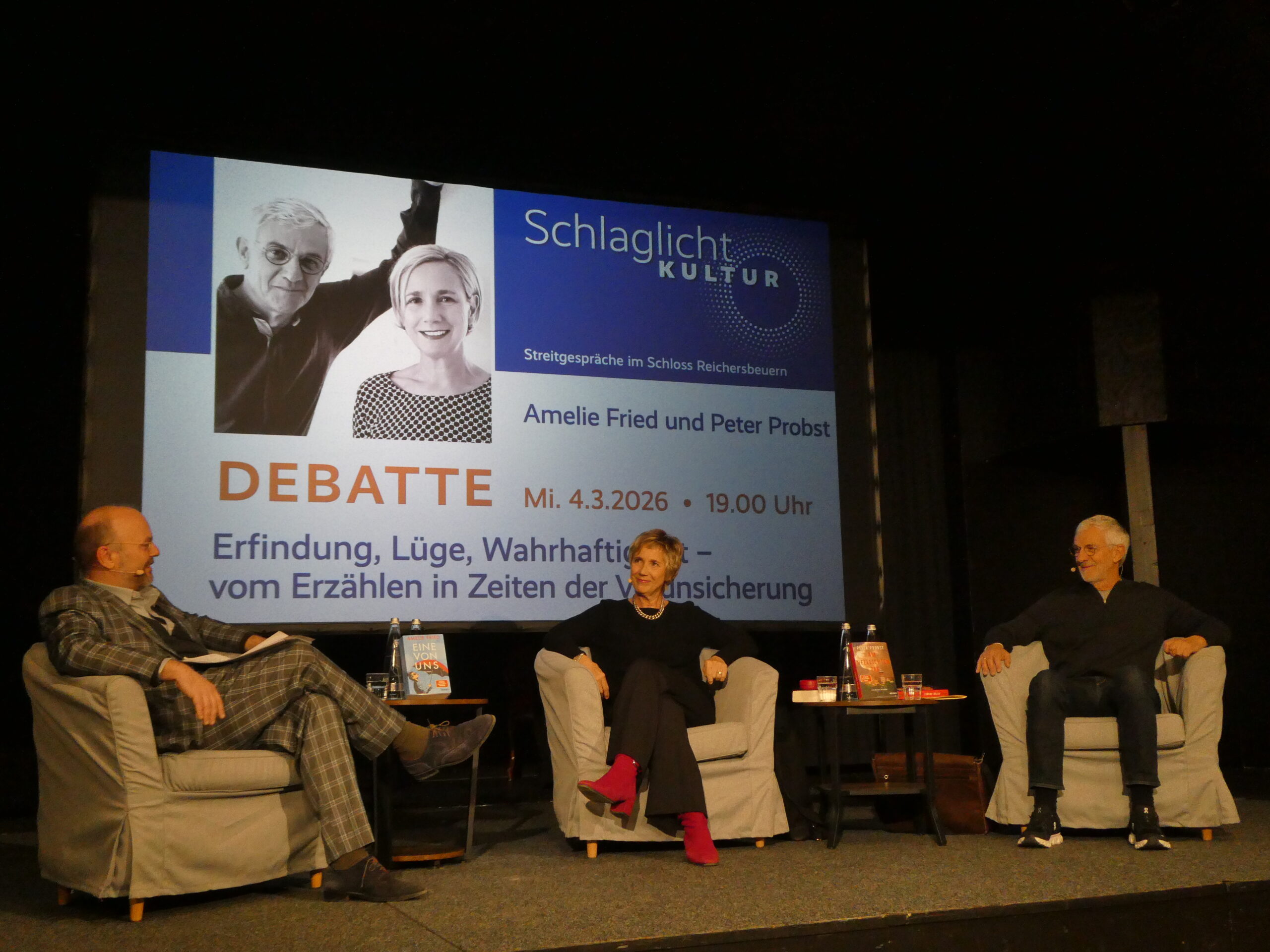 „Erfindung, Lüge, Wahrhaftigkeit – Erzählen in Zeiten der Verunsicherung“ war das Thema des Gesprächs mit der Schriftstellerin Amelie Fried und ihrem Mann Peter Probst, Drehbuchautor für Fernsehkrimis. Nikolaus Frei, Leiter der Theatergruppe des Gymnasiums, moderierte die Diskussion.