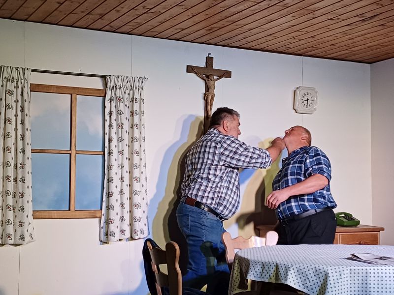 Bei Toni ist das Fass am Überlaufen und es beginnt eine fantastisch inszenierte Prügelei in Zeitlupe im Rhythmus des Donauwalzers, ein toller Regiegag, mit Szenenapplaus honoriert. Und Toni wünscht dem Sepp, dass ihn doch der Teufel holen möge.