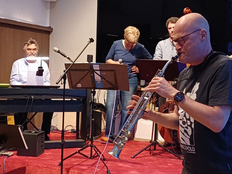 „Wir spielen in a-Moll“ hieß es lapidar und Saxofonist Raphael Dreifuss übernahm per Blickkontakt, Kopfnicken oder Zuruf das erste Solo, Hans Danninger am Akkordeon und Posaunist Elmar Stein folgten, sowie Bernd Stahuber am Piano.