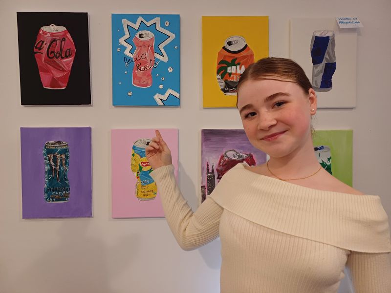 Zwölf- bis 15-jährige Kursteilnehmerinnen hatten sich der Aufgabe gewidmet, eine zerdrückte Getränkedose mit Acryl auf Leinwand zu malen. „Hier ging es um Perspektive, Lichtbrechung und Farbigkeit, wobei jede ihre Freiheit hatte und auch ihre eigene Handschrift aufweist“, konstatiert Valerija Vuk Strobel.