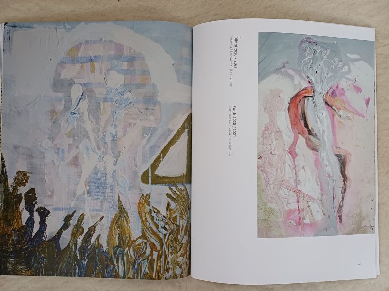 Bei der reinen Malerei habe ihn in der Coronazeit besonders die gesellschaftliche Situation beschäftigt, sagt er. Dies spiegelt sich in den Bildern „Diktat“, ein Kopf, in dem sich Politiker und Wissenschaftler tummeln und darunter die fragende Menschenmenge oder auch das Bild „Panik“.