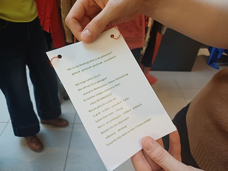 Angelika Hubner hatte Kärtchen mitgebracht, auf denen die Geberin Details zu ihren Kleidungsstücken offenbaren konnten, etwa, „den Blazer habe ich zu meiner Hochzeit getragen und ich freue mich, wenn er eine zweite Chance bekommt“.