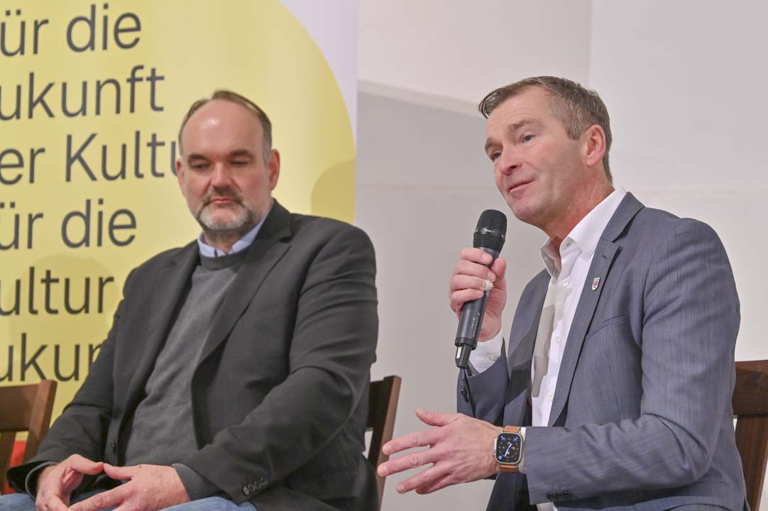 Thomas Tomaschek (links) und Jens Zangenfeind diskutieren auf dem Kulturpodium über die Zukunft der Kulturförderung im Landkreis Miesbach. Foto: Petra Kurbjuhn