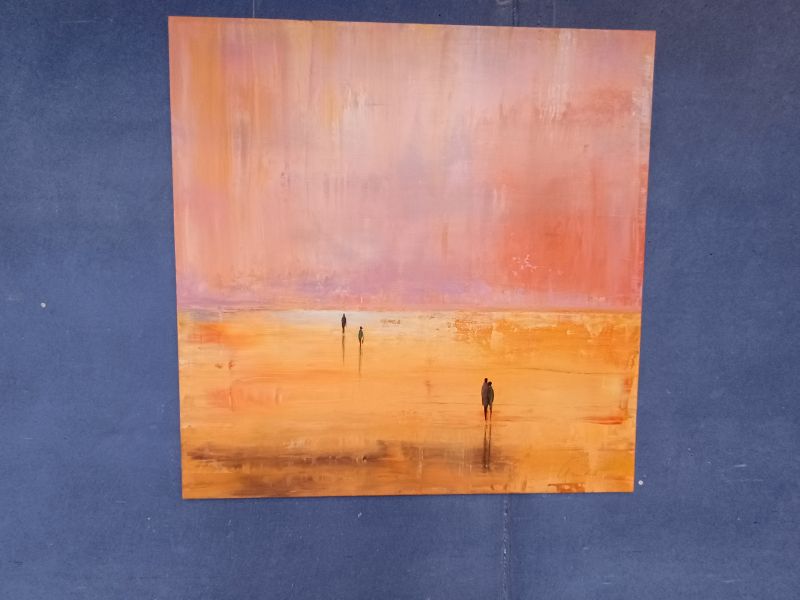 Das zweite Bild ist eine realistische Darstellung und heißt „Anmut“. Vor einer angedeuteten Landschaft in Gelb-Orange steht ein junges Mädchen mit gesenktem Kopf. Er habe sich von einem Foto inspirieren lassen, erklärt Claudio Fischerkeller und sich an dieses neue Thema herangewagt. Da er zumeist in Serien arbeite, werde er auf diesem Experiment aufbauen und sich an einer neuen Thematik ausprobieren.