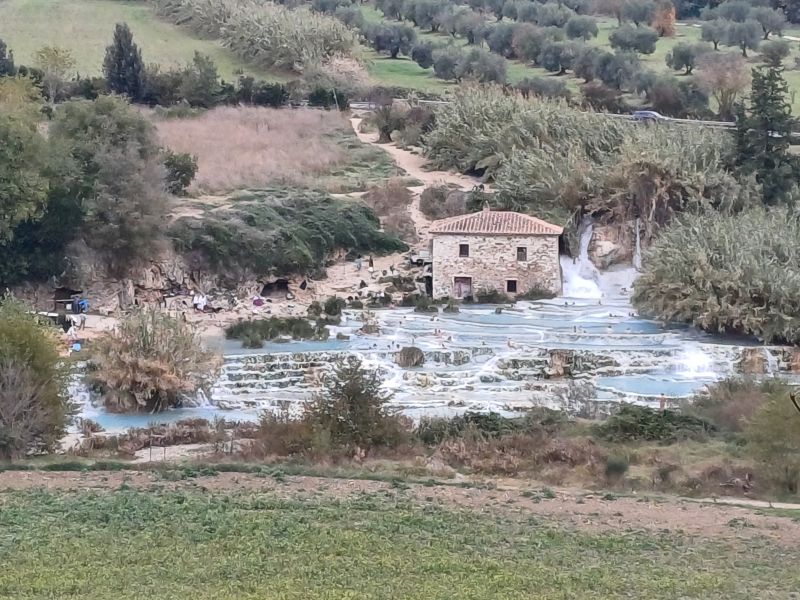 Ein wichtiges Ausflugsziel der Maremma sind die Thermen. Wir entscheiden uns für die „Cascate del Mulino“ in Saturnia. Das über Felsen fließende Wasser lädt zum Sitzen in zahlreichen Wasserfällen ein. Die Thermalfelder mit einer Temperatur von 37,5 °C sind kostenlos und rund um die Uhr zugänglich.