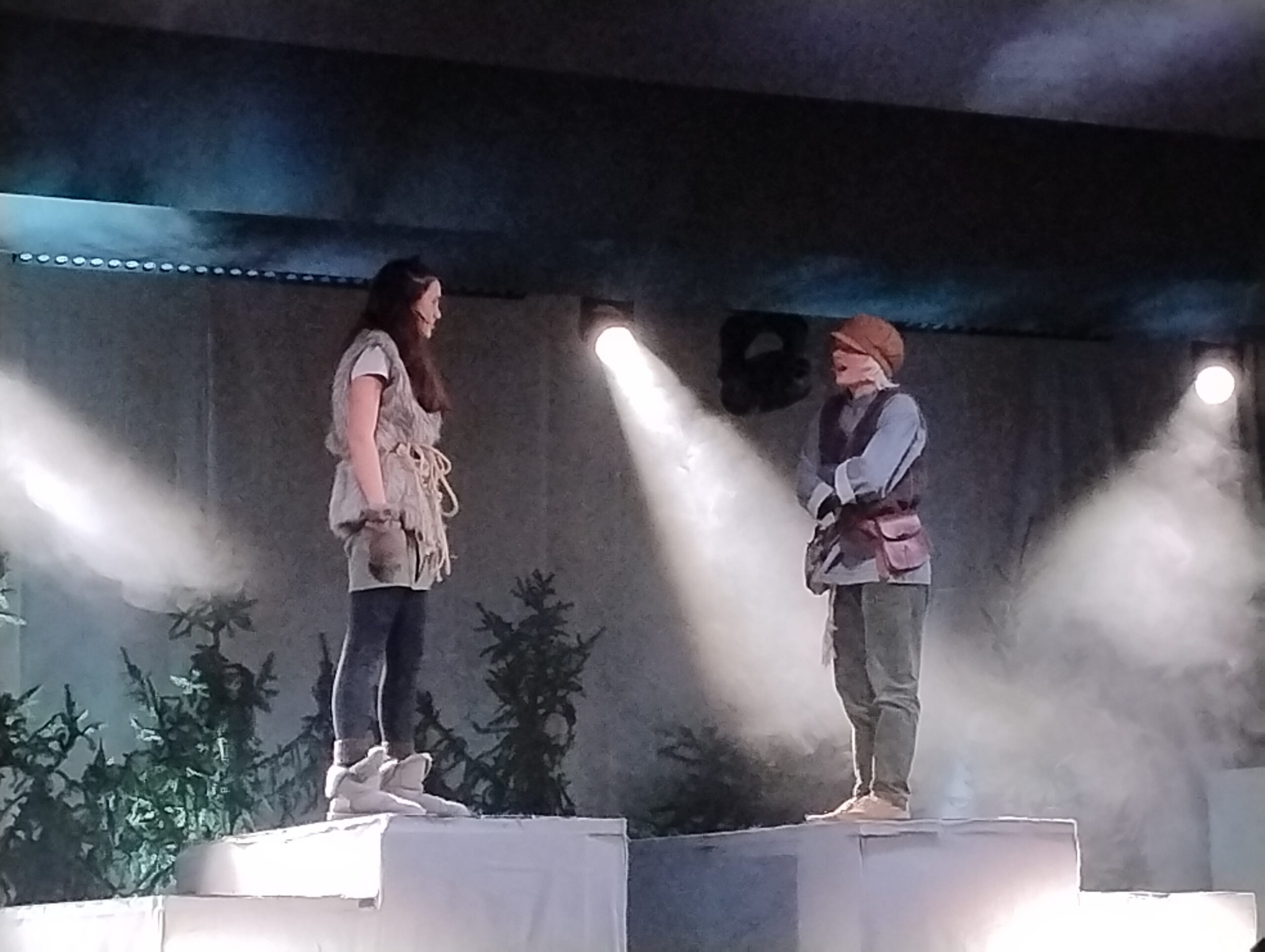 Auf sich allein gestellt erproben Ronja und Birk ihr Leben im Wald und begegnen dabei allerlei gefährlichen Wesen: den irre kichernden Rumpelwichten (Edda Barthel und Lara Posztos), den unheimlichen Graugnomen (Edda Barthel, Lara Posztos, Michael und Konstantin Poltawez) und den furchteinflößenden Wilddruden (Lara Posztos). Vor ihnen retten sich die beiden schließlich mit einem Sprung in den reißenden Fluss. Gerade diese spannungsgeladenen Szenen überzeugen nicht nur durch das engagierte Schauspiel der jungen Darsteller, sondern auch durch das gekonnte Zusammenspiel von Licht, Ton und der hervorragend aufspielenden Band unter der Leitung von Erich Kogler. Die Musik des Abends stammt aus der Feder von Wolfgang Hierl und trägt die Inszenierung atmosphärisch durch den Abend.