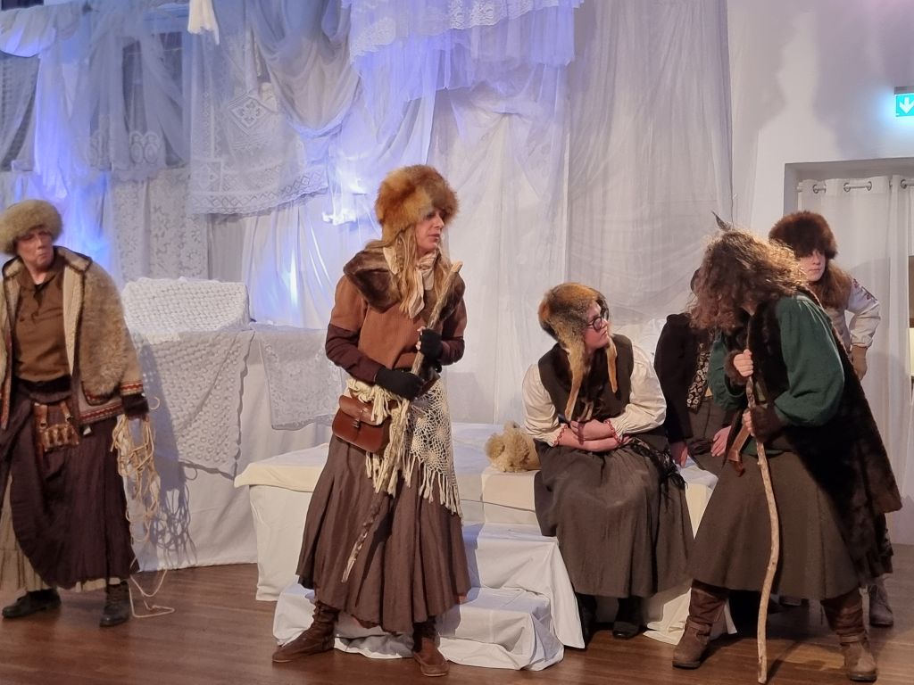 Der Festsaal des Valleyer Schlossbräu ist derzeit nicht mehr wiederzuerkennen, denn er hat sich in ein Winterwunderland aus einer anderen Welt verändert. Von einem Bühnenbild ist hier nicht zu sprechen, denn schon wie im „Sommernachtstraum“ in Holzkirchen, stehen die Darsteller auch hier nicht isoliert vom Publikum auf einer Theaterbühne. Das bunt gemischte Publikum im ausverkauften Saal sitzt mittendrin in der Kulisse. Ist hautnah dran an den Laienspielern von Dramadama, welche „Die Schneekönigin“ frei nach dem Märchen von Hans Christian Andersen von Helmut Münchhausen spielen.