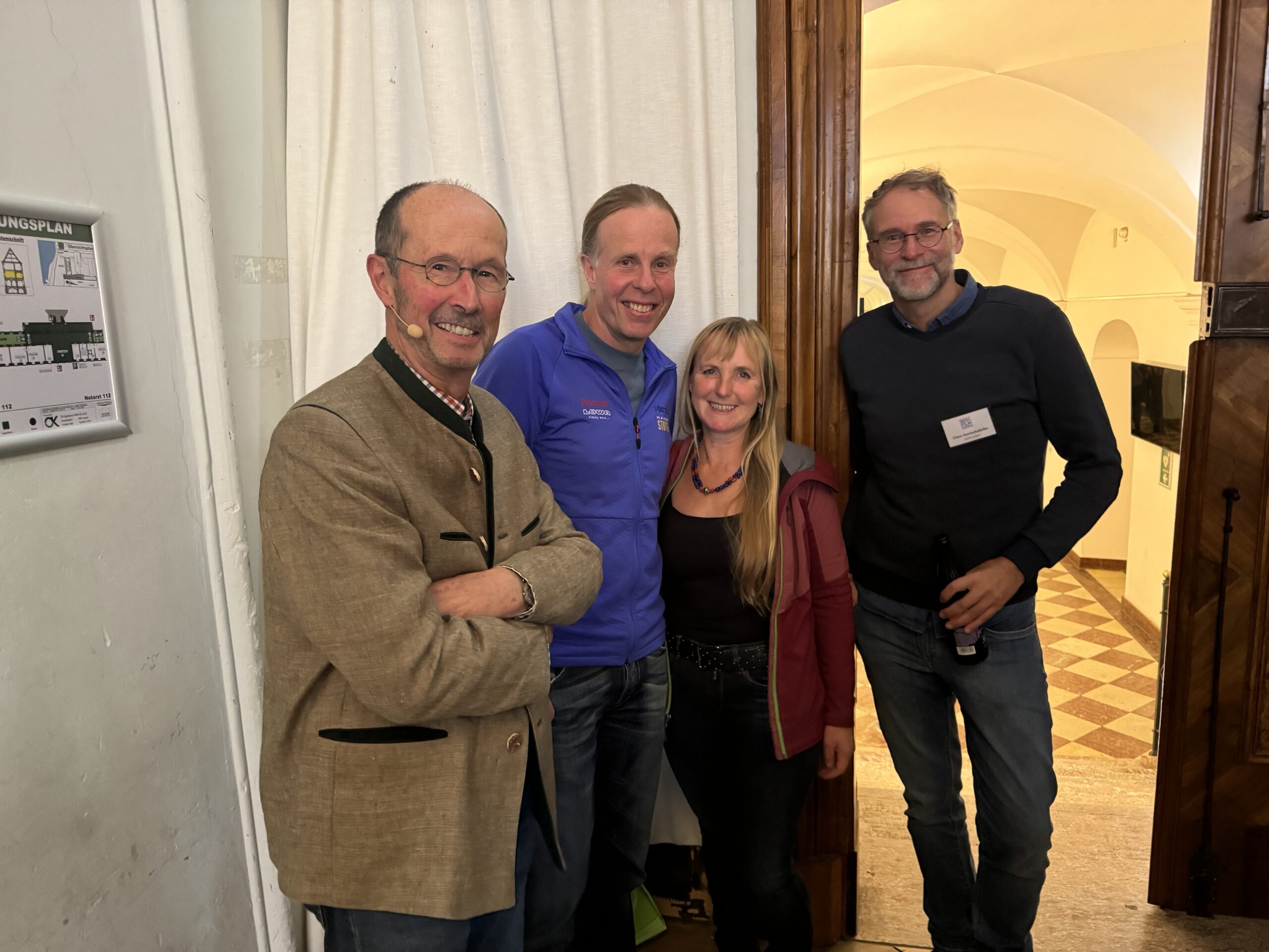 Die Protagonisten von Claus Hanischdörfers (rechts) Film „Gipfel-Liebe“ Daniela Jaspers (2.v.r.) und Robert Jaspers (3.v.r.) treffen den Festivalleiter Michael „Micki“ Pause (links).