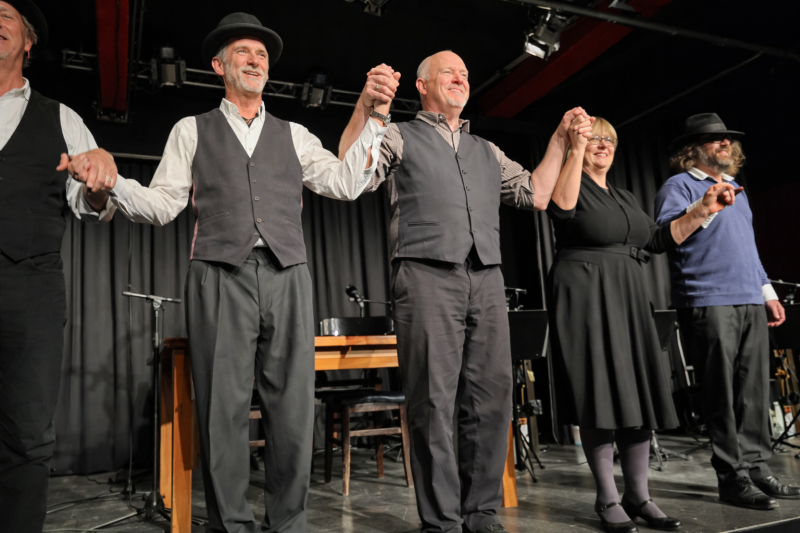 Ein kongeniales Element des Abends ist die – im Programm als „vogelwild“ charakterisierte – musikalische Begleitung. Trotz eigentlich „klassischer“ bayrischer Besetzung mit mit Akkordeon, Tenorhorn, (Florian Burgmayr), Tuba, Posaune (Leo Gmelch), Trompete (Peter Tuscher) und Schlagwerk (Yogo Pausch) biedert sich das „Art Ensemble of Passau“ nicht an banale Volksmusik an, sondern kreiert eine groteske Klangwelt. Marschmusik, Jahrmarks-Tingeltangel, Jazz, Tango, Kirchenchoral werden aneinander gereiht und mit Dissinanzen entfremdet, die Posaune imitiert schließlich gar ein australisches Didgeridoo: Die dörflich-bayrische Ordnung ist total aus den Fugen geraten, die Musik zeichnet dies schaurig-vital als Klanggemälde nach. Eine Musik irgendwo zwischen Kurt Weill und Schostakowitsch, extra für dieses Theaterstück von Florian Burgmayr komponiert.